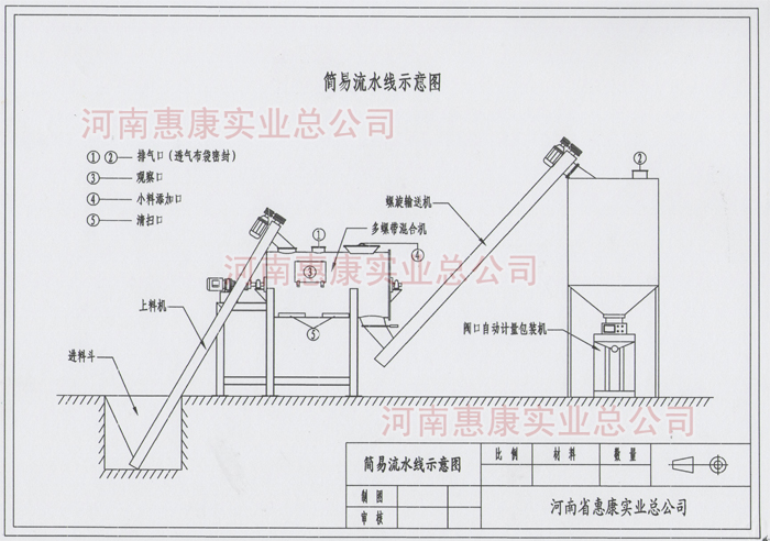 簡(jiǎn)易型流水線(xiàn)主要由螺旋上料機(jī)、多螺帶混合機(jī)、二次提升機(jī)、儲(chǔ)料倉(cāng)、閥口自動(dòng)定量包裝機(jī)等組成。
