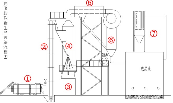原砂—預(yù)熱爐—斗式提升機—珍珠巖膨脹爐—水冷系統(tǒng)—蝸牛式分離器—風送系統(tǒng)—稱量包裝—除塵系統(tǒng)